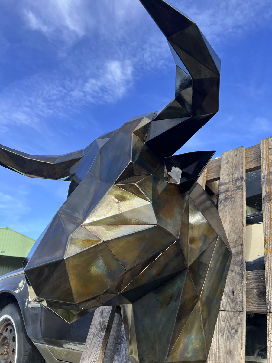 Présentation de cette sculpture sur mesure, un buste de taureau en origami. Un ensemble réalisé entièrement en tôle, soudé et...