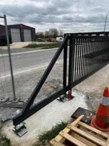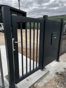 Conception, fabrication et pose d’un portail en acier barreaudé autoportant. La conception autoportante permet un passage fluide des véhicules, sans seuil ni rail.